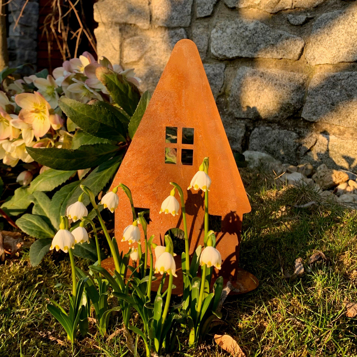 Kovový domeček nižší s rezavou patinou na podstavci jako venkovní i vnitřní jedinečná dekorace. Odolná a udržitelná. Výška domečku 25 cm, šířka 16 cm. Dekorace k dozdobení, které vynikají v truhlících, květináčích, ale i jako samostatné solitéry.