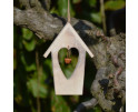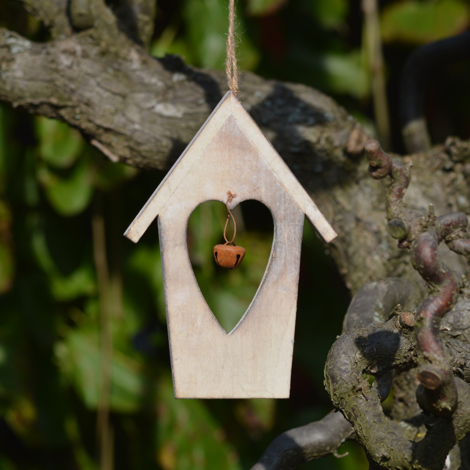 Dřevěný domeček k zavěšení s rolničkou. Vánoční dekorace z lehkého dřeva s vykrojeným srdcem a rolničkou uvnitř. Krásně se hodí třeba k balení dárků. 13 x 1 x 18,5 cm.