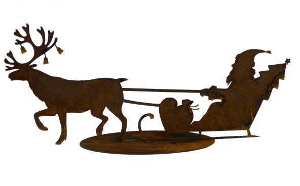 Vánoční dekorace Santa na saních 20 cm vysoká, 45 cm dlouhá. Krásná dekorace na okenní parapet venku i doma. Výjimečná ozdoba pro použití do truhlíku. Na podstavci. Rezavý kov.