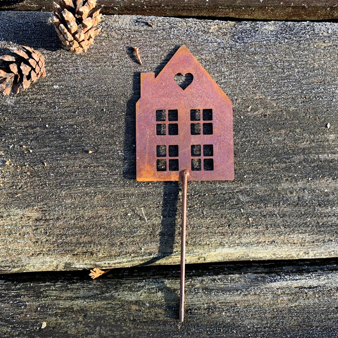 Kovový zápich domeček s rezavou patinou. Krásná dekorace do truhlíků či květináčů. Vhodný k dozdobení dekorací a věnců. Výška domečku 10 cm, celková výška se zápichem 19,5 cm. Šířka 7 cm.
