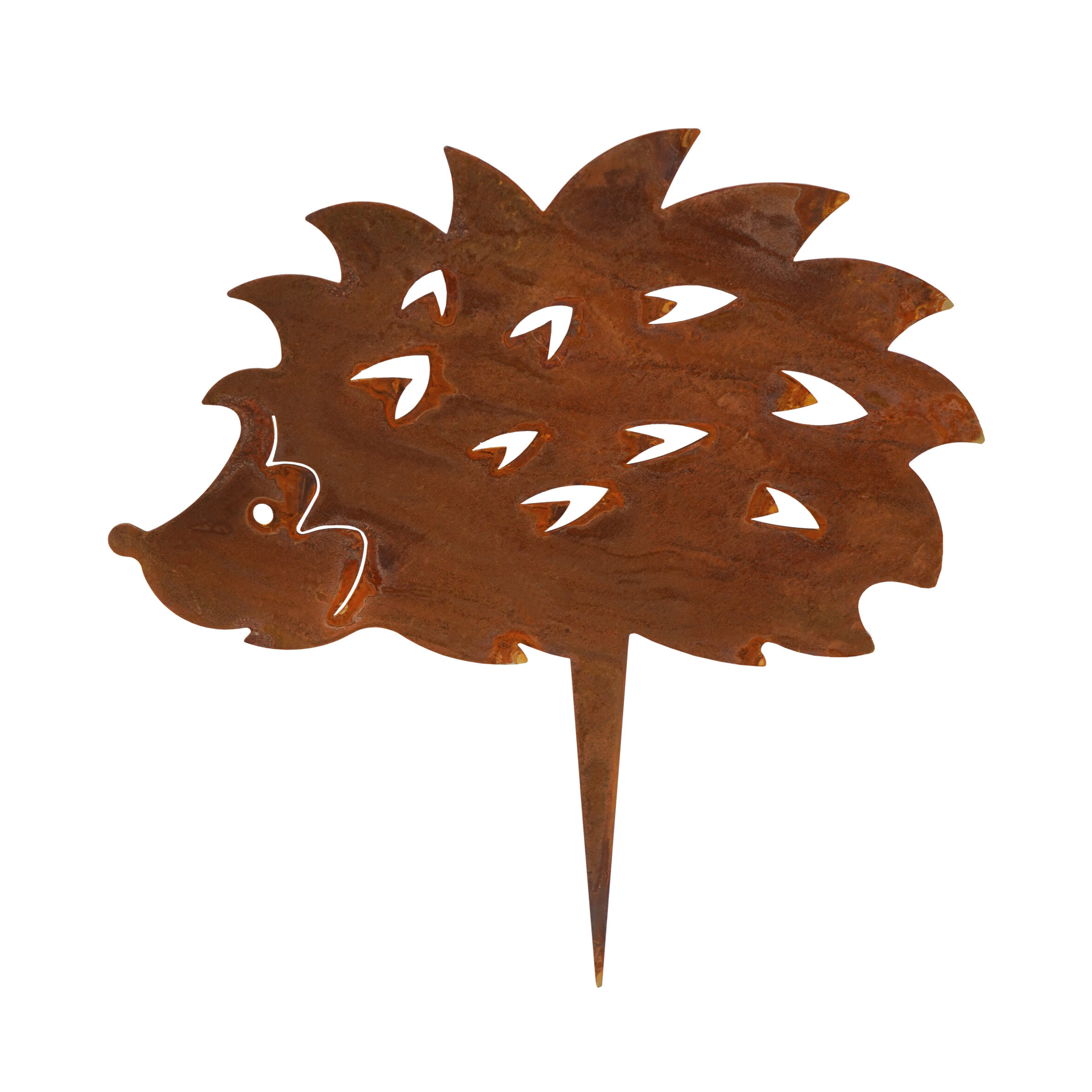 Zápich ježek s rezavou patinou k zapíchnutí do záhonu, truhlíku, interiérová i venkovní dekorace. Výška 14 cm, s trnem 24 cm, šířka 20 cm.
